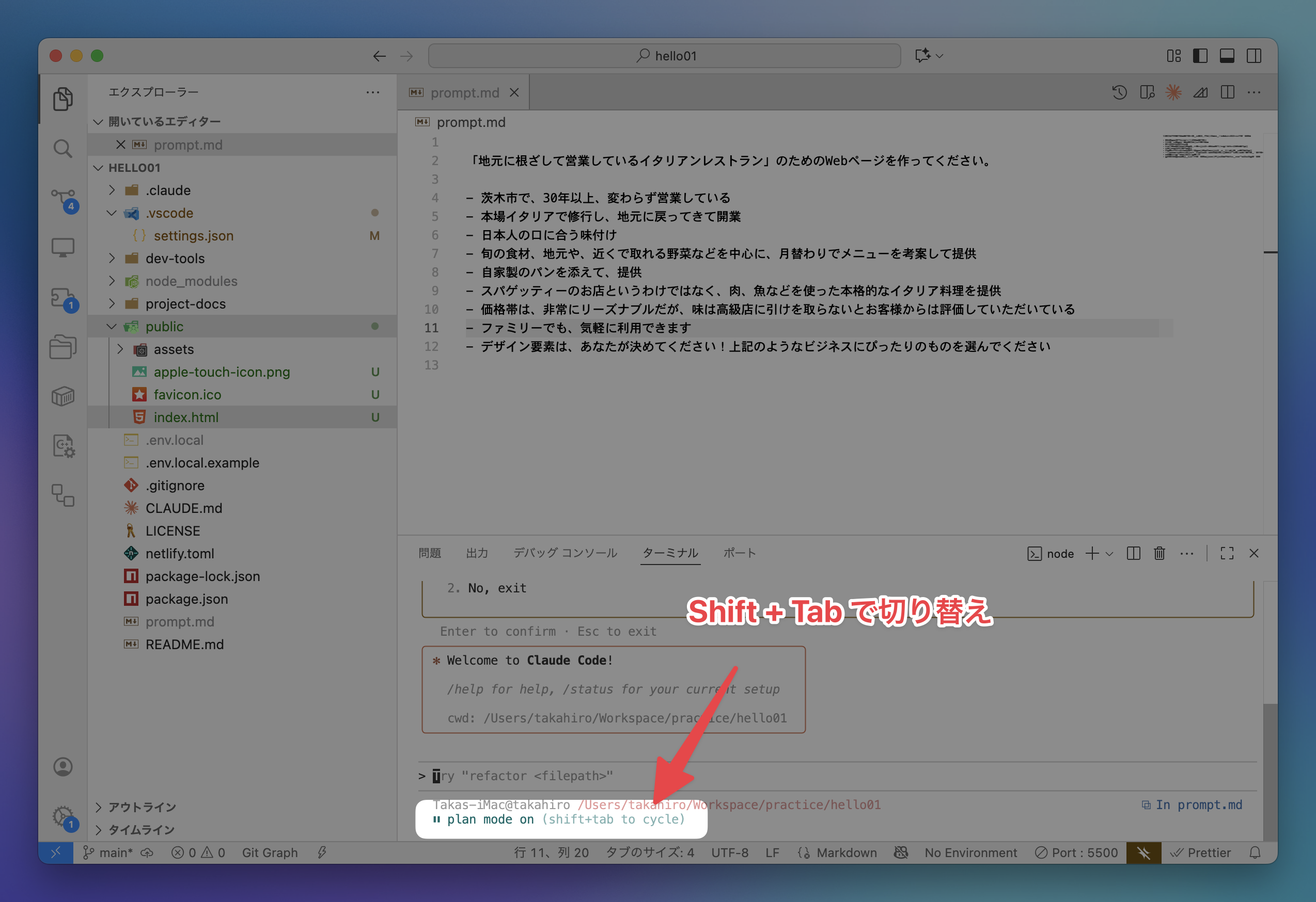 この方法は複雑な指示や長い指示を出す際に特におすすめです。また、漢字変換中に、間違って送信しないためにも、prompt.md で下書きをして、コピー&ペーストするのもおすすめです。