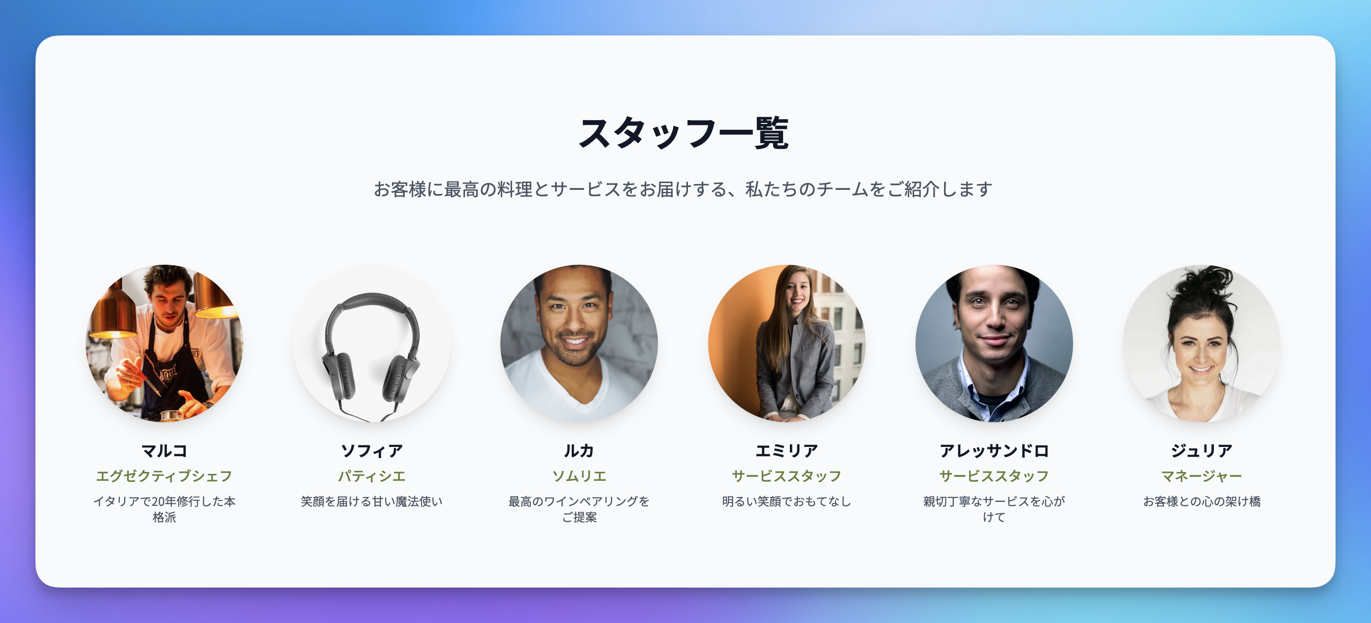 スタッフ一覧、チームメンバー紹介セクションを作る場合、以下を参考にしてください。